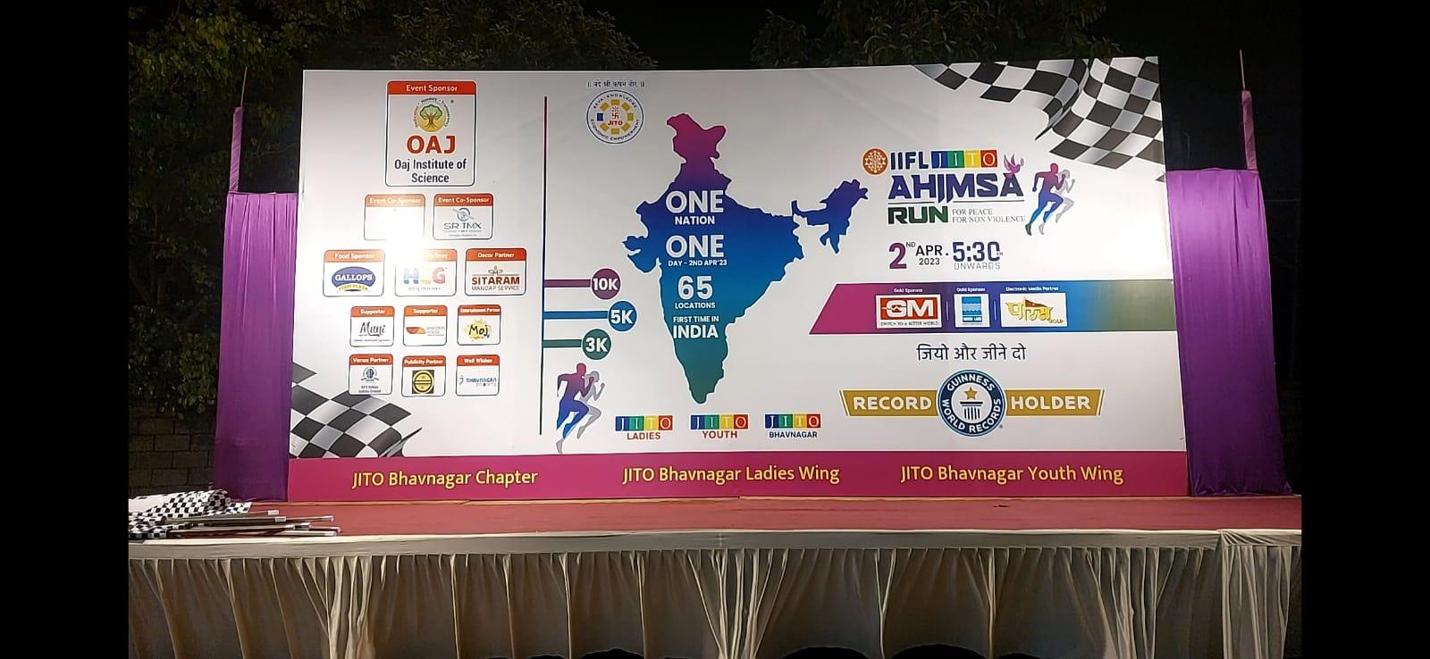 જૈન ઇન્ટરનેશનલ ટ્રેડ ઓર્ગેનાઇઝેશન એટલે કે જીતો દ્વારા અહિંસા રન મેરેથોનનું આયોજન કરવામાં આવ્યું હતું.ભાવનગર શહેરના ગુલીસ્તા ગ્રાઉન્ડ ખાતે કમિશ્નર,ધારાસભ્ય સહિતના મહાનુભવોની ઉપસ્થિતિમાં સમગ્ર વિશ્વની શાંતિ અને ઉન્નત્તિ માટે ભગવાન મહાવીરના અહિંસાનો ઉપદેશ લોકો સુધી પહોંચે તે માટે 1500 જેટલા દૌડ લગાવી હતી જ્યારે કુલ 65 સ્થાનો પર 1.30 લાખ લોકોની અહિંસા રન મેરેથોનને ગિનિસ બુક ઓફ વર્લ્ડ રેકોર્ડમાં સ્થાન મળ્યું છે. જીતો (જૈન ઇન્ટરનેશનલ ટ્રેડ ઓર્ગેનાઇઝેશન)દ્વારા સમગ્ર ભારત અને વિદેશમાં લગભગ 65 કરતા વધારે સ્થળોએ આજે સવારે 5.30 કલાકે અહિંસા રન મેરેથોનનું આયોજન કરવામાં આવ્યું હતું.સમગ્ર વિશ્વની શાંતિ અને ઉન્નત્તિ માટે ભગવાન મહાવીરના અહિંસાનો સંદેશ દરેક સુધી પહોંચે એ આશય થી 1.30 લાખ કરતા વધારે લોકો આ અહિંસા રન માં જોડયા હતા
