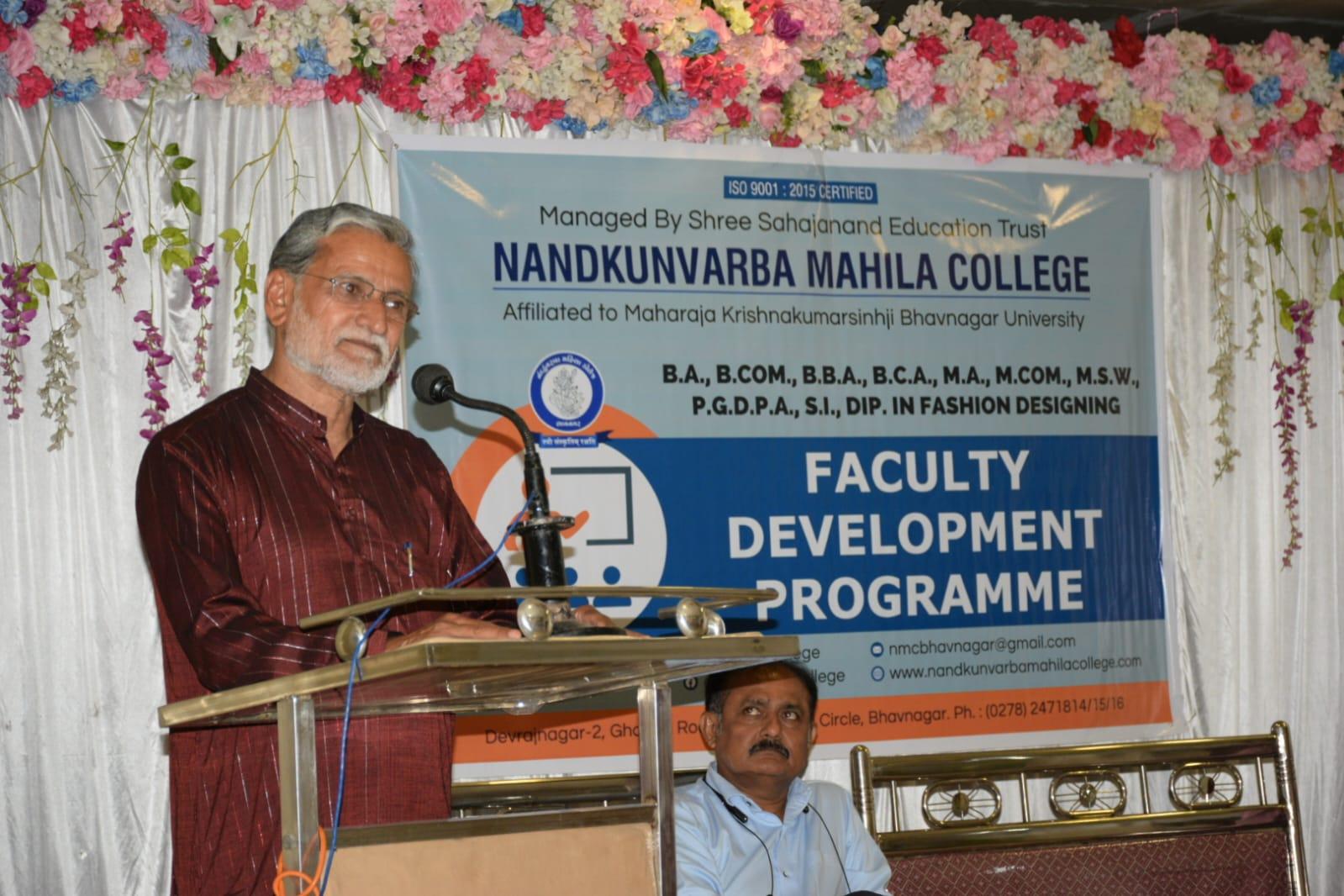 નંદકુંવરબા મહિલા કોલેજ દેવરાજ નગર ખાતે યોજાયેલ આ ફેકલ્ટી ડેવલપમેન્ટ કાર્યક્રમ નું ઉદ્ઘાટન એમ . કે બી . યુનિવર્સિટી ના પૂર્વ કાર્યકારી કુલપતિ ડૉ.એચ.એન.વાઘેલા એ કર્યું હતું , જયારે અલગ અલગ સેશન માં વક્તા તરીકે લોકભારતી સણોસરા ના પૂર્વ નિયામક ડૉ.અરુણભાઈ દવે બી , એડ કોલેજના પૂર્વ આચાર્ય ડૉ.મનોહરભાઈ ઠાકર અને ભાવનગર ના પૂર્વ સાંસદ રાજેન્દ્રસિંહ રાણાએ આ કાર્યક્રમમાં અધ્યાપકો માર્ગદર્શન આપ્યું હતું.