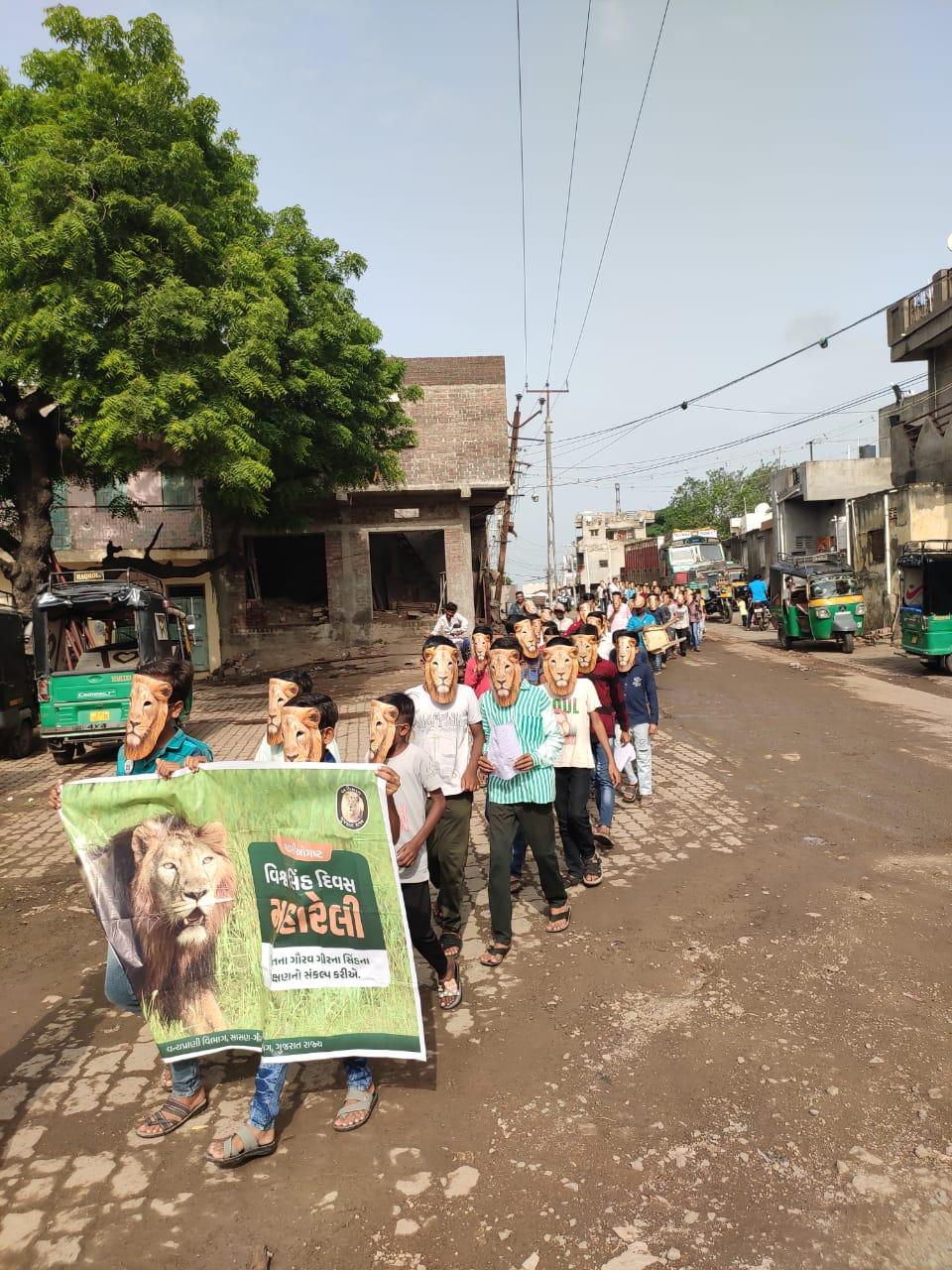 સિંહનાં મહોરાં પહેરીને શાળાના ૨૮૩ બાળકોની રેલી યોજાઇ