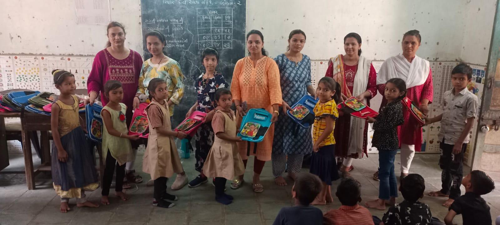 જેમાં શાળાના ભૂતપૂર્વ વિદ્યાર્થી અને દાતા શ્રી કેયુરભાઈ ગુલાબભાઈ પલાણીયા તથા જિજ્ઞાસાબેન તથા અંકિતાબેન તથા જાસ્મીનબેન અને નમ્રતાબેન સહિતના મહાનુભાવો ઉપસ્થિત રહ્યા હતા. અહીં ધો ૧ થી ૮ના ૨૯૪ બાળકોને મોટી સ્કુલ બેગ આપવામાં આવી હતી જે ને લઈ વાલીઓમાં આનંદ સાથે શાળા આચાર્ય દ્વારા આભારની લાગણી વ્યક્ત કરી હતી