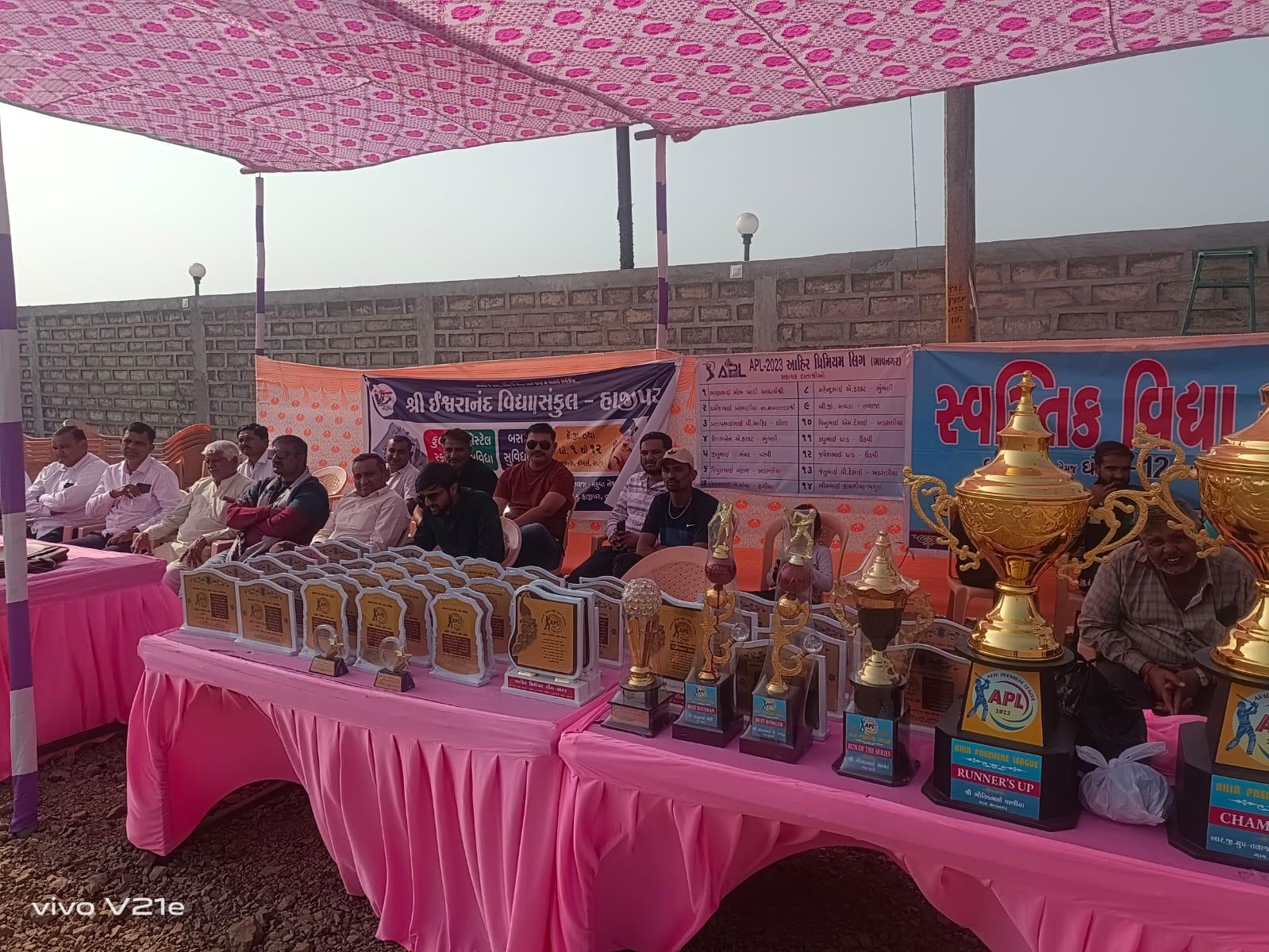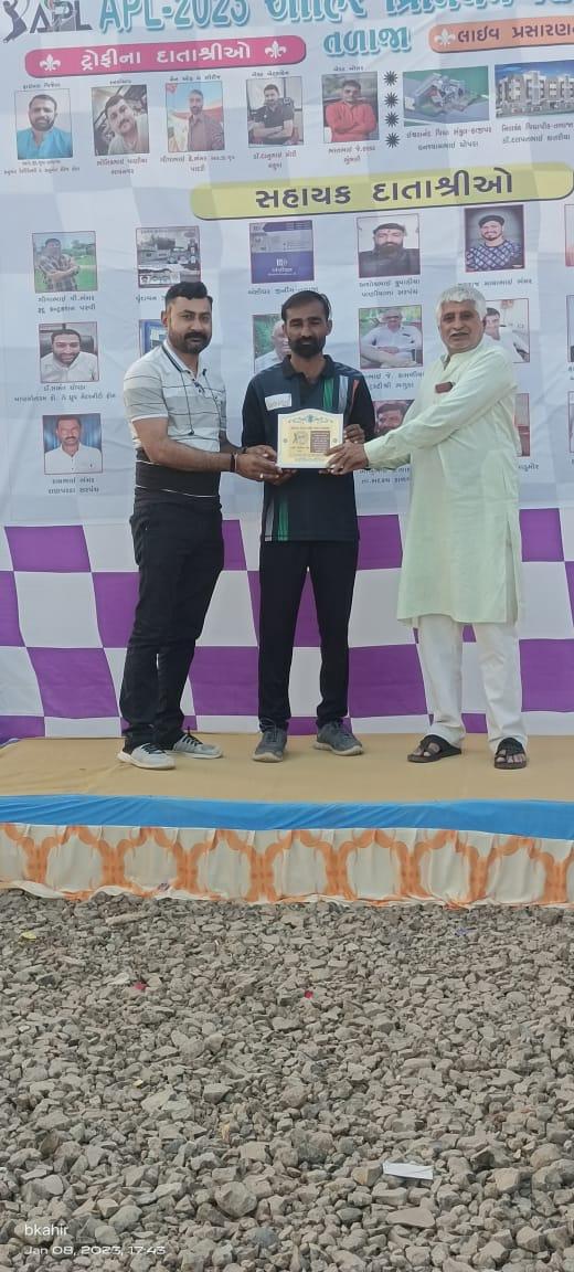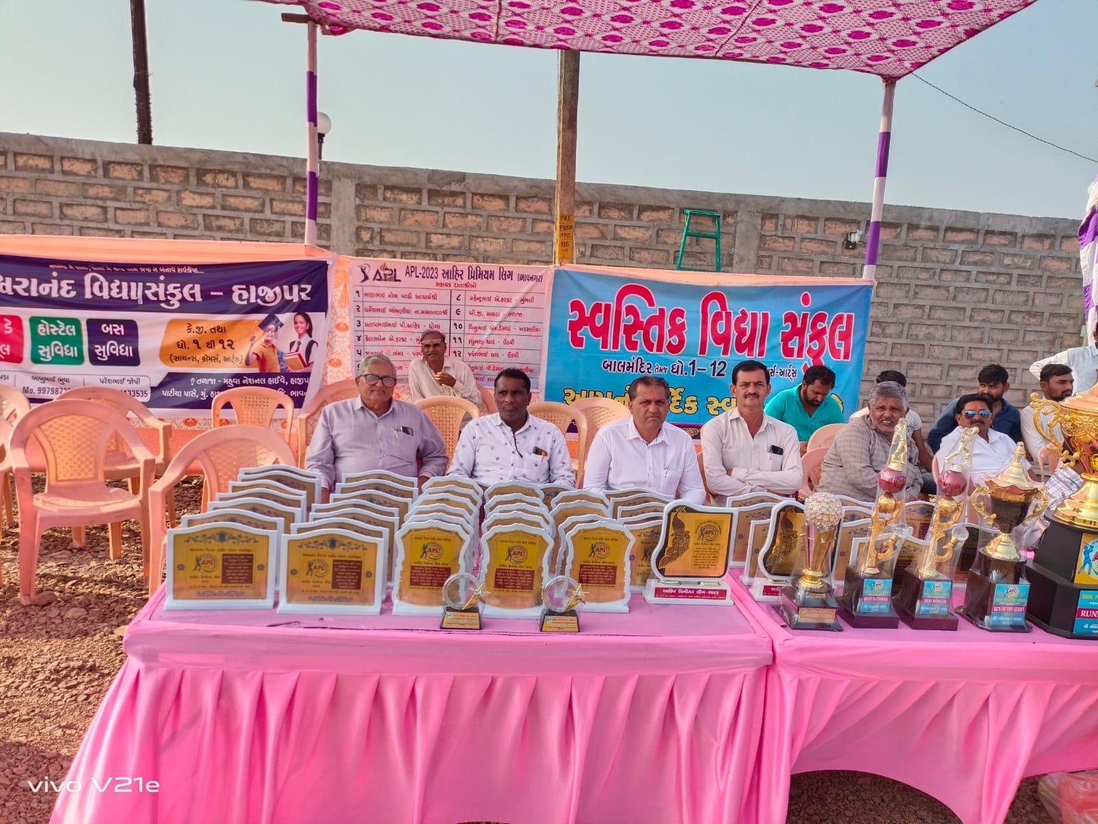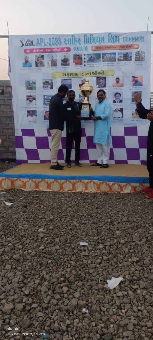 સમાજના યુવાનોમાં એકતા જળવાયેલી રહે સમાજના લોકો એક બીજાને ઓળખતા થાય અને સમાજની એકતા જળવાયેલી રહે તેવા ઉમદા હેતુથી આહીર પ્રીમિયમ લીગ 2023 ક્રિકેટ ટુર્નામેન્ટનું આયોજન કરવામાં આવ્યું હતું. તળાજા ખાતે યોજાયેલી આહીર પ્રીમિયમ લીગ 2023 ક્રિકેટ ટુર્નામેન્ટમાં 12 ટીમોએ ભાગ લીધો હતો આહીર પ્રિમિયર લીગ APL 2023નું તળાજા મુકામે આયોજન કરવામાં આવ્યું