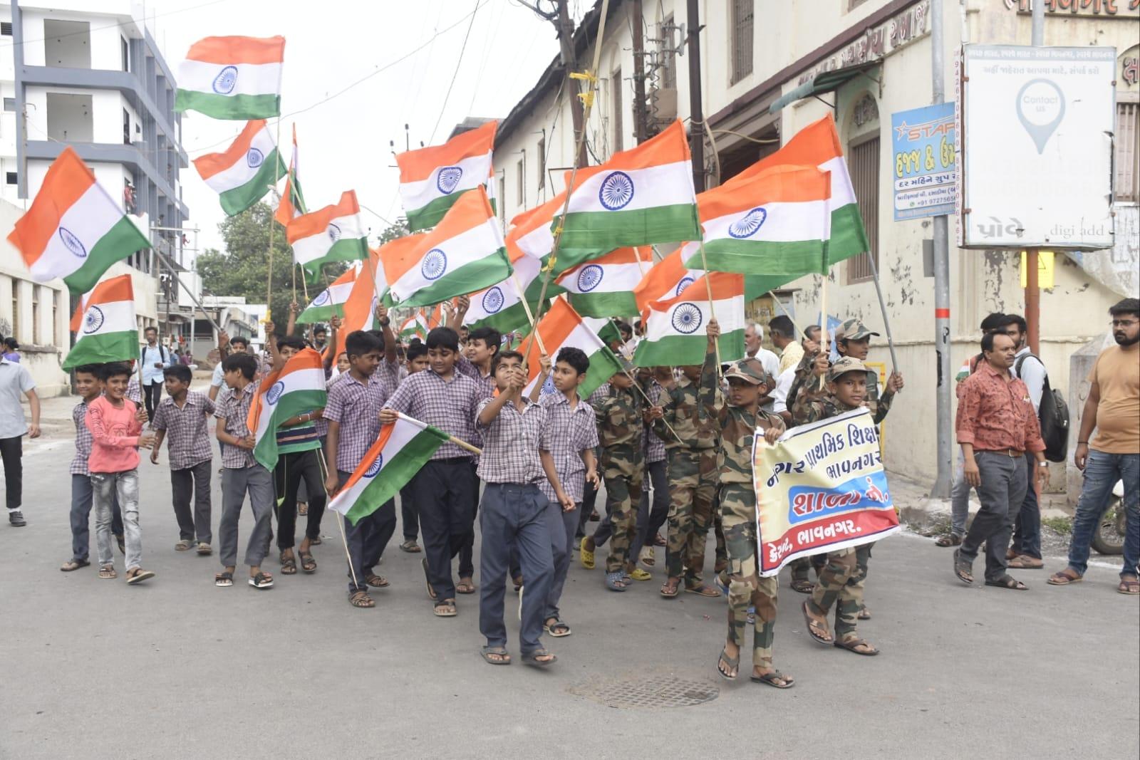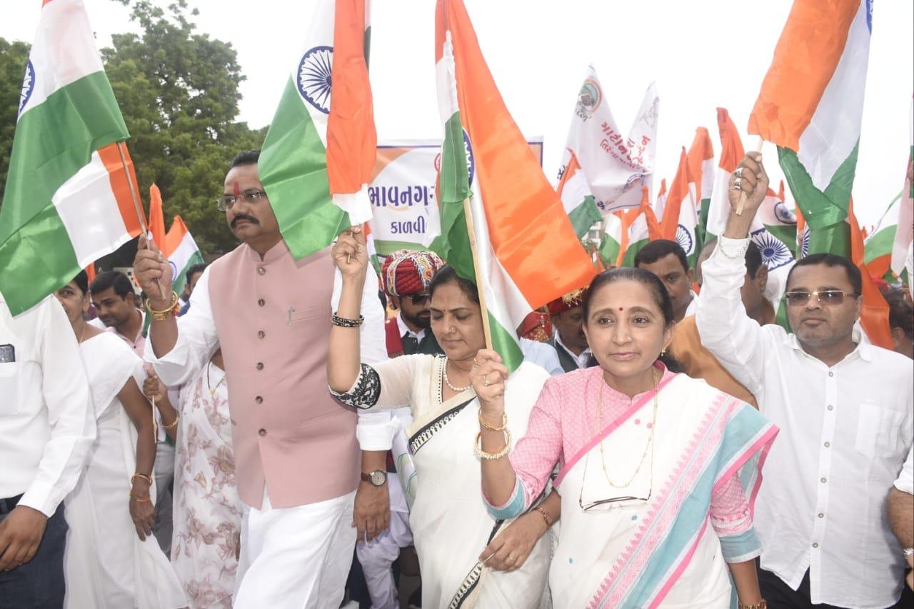 ભાવનગરને આંગણે યોજાયેલી તિરંગા યાત્રામાં સમગ્ર ભાવનગર શહેર રાષ્ટ્રભક્તિના ઉમંગ અને ઉત્સાહના અવસરે હિલોળે ચડ્યું હતું. જ્યાં જુઓ ત્યાં તિરંગાના ત્રી-રંગો સમગ્ર શહેરની આભા અને શોભામાં જ્યારે વૃદ્ધિ કરી રહ્યાં હતાં. ‘તિરંગા હવાઓ સે નહીં, લેકિન વીરો કી સાંસો સે લહેરાતાં’ ની પ્રતીતિ કરાવતાં રાષ્ટ્રભક્તિથી તરબોળ એવી આ તિરંગા યાત્રાનો શુભારંભ મેયર શ્રીમતિ કીર્તિબાળા દાણીધારીયાએ એ.વી. સ્કૂલ ખાતેથી કરવામાં આવ્યો હતો.