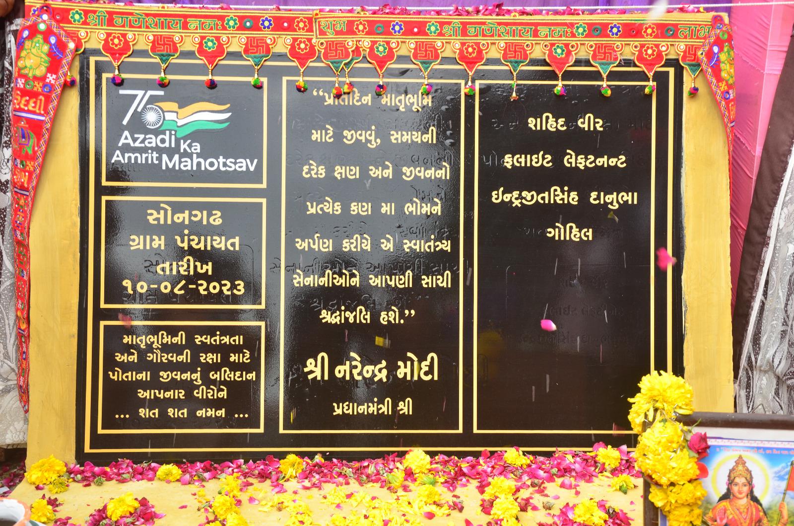 જમ્મુ કાશ્મીરમાં ઓપરેશન દરમ્યાન હેલિકોપ્ટર ક્રેશમાં શહીદ થયેલા ફ્લાઇટ લેફટન્ટ શ્રી ઇંદ્રજીતસિંહ ગોહિલના પરીવારજનોનું સન્માન, મારી માટી, મારો દેશ’ અભિયાન અંતર્ગત સોનગઢ ખાતે શીલાફલકમનુ અનાવરણ